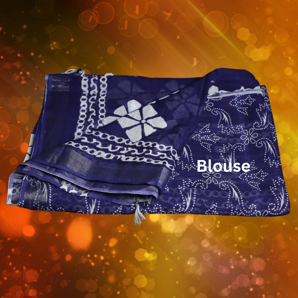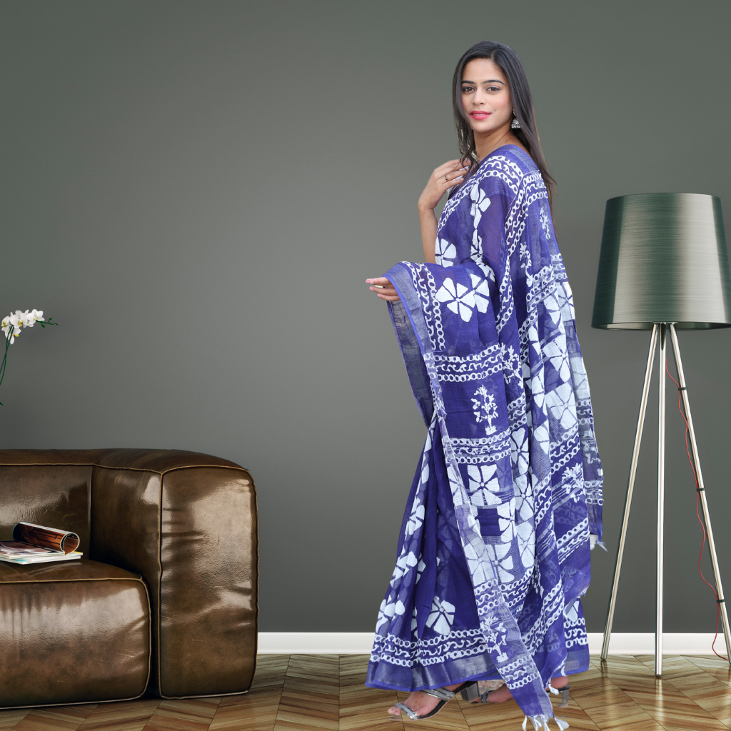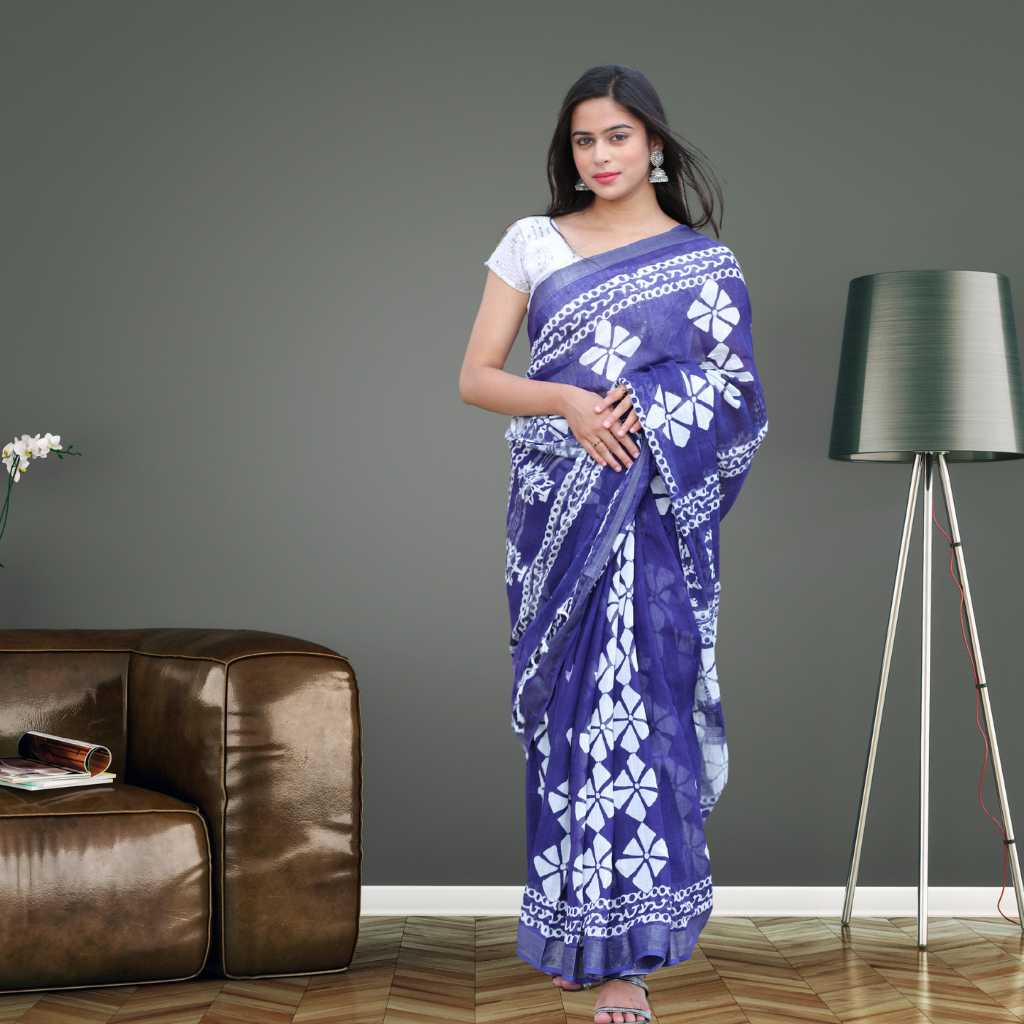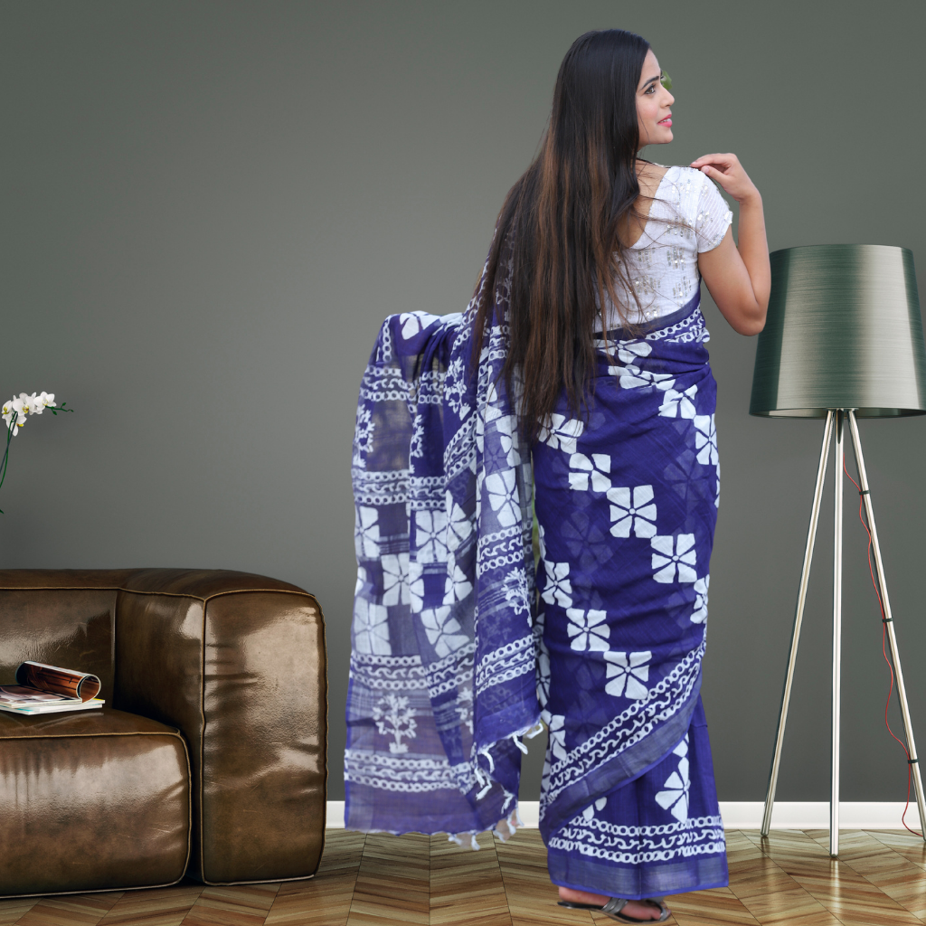Bagru Print Cotton Linen Saree – Indigo colour
