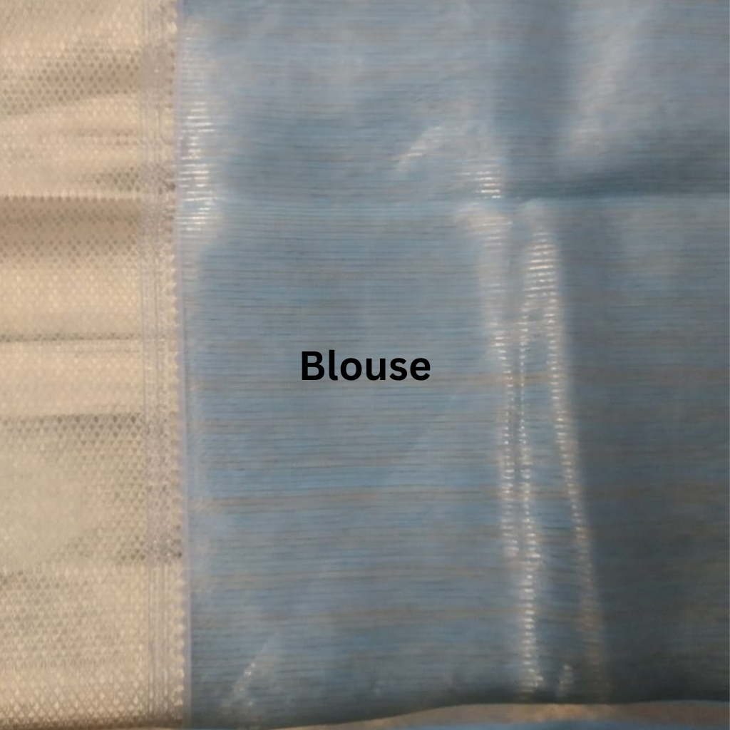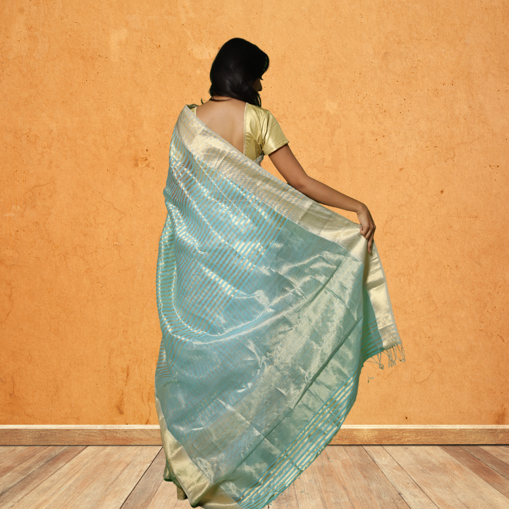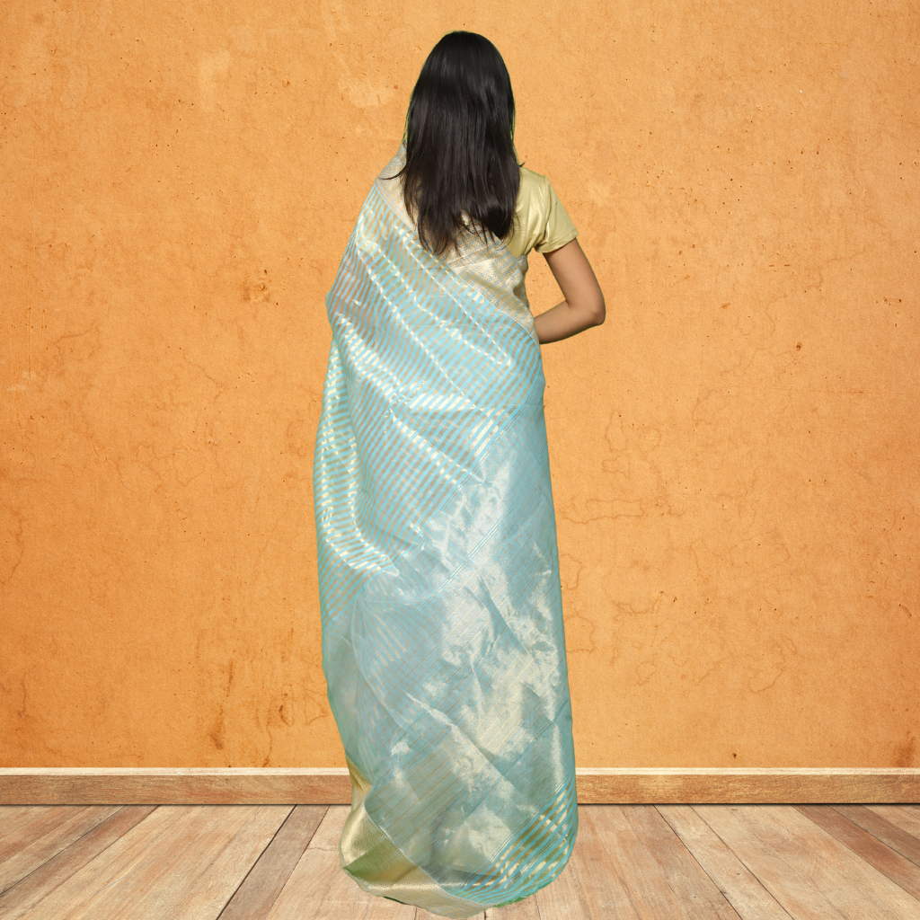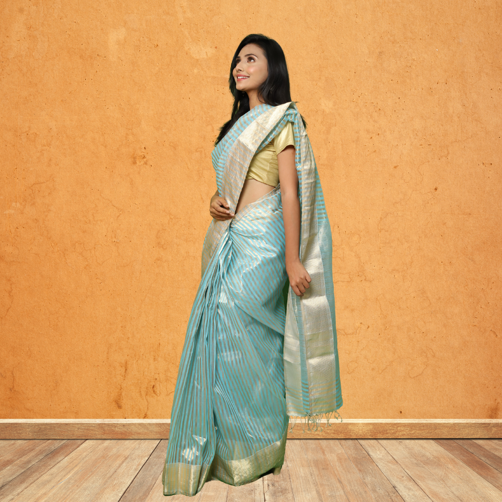 Light Skyblue and golden Stripes all over the saree |